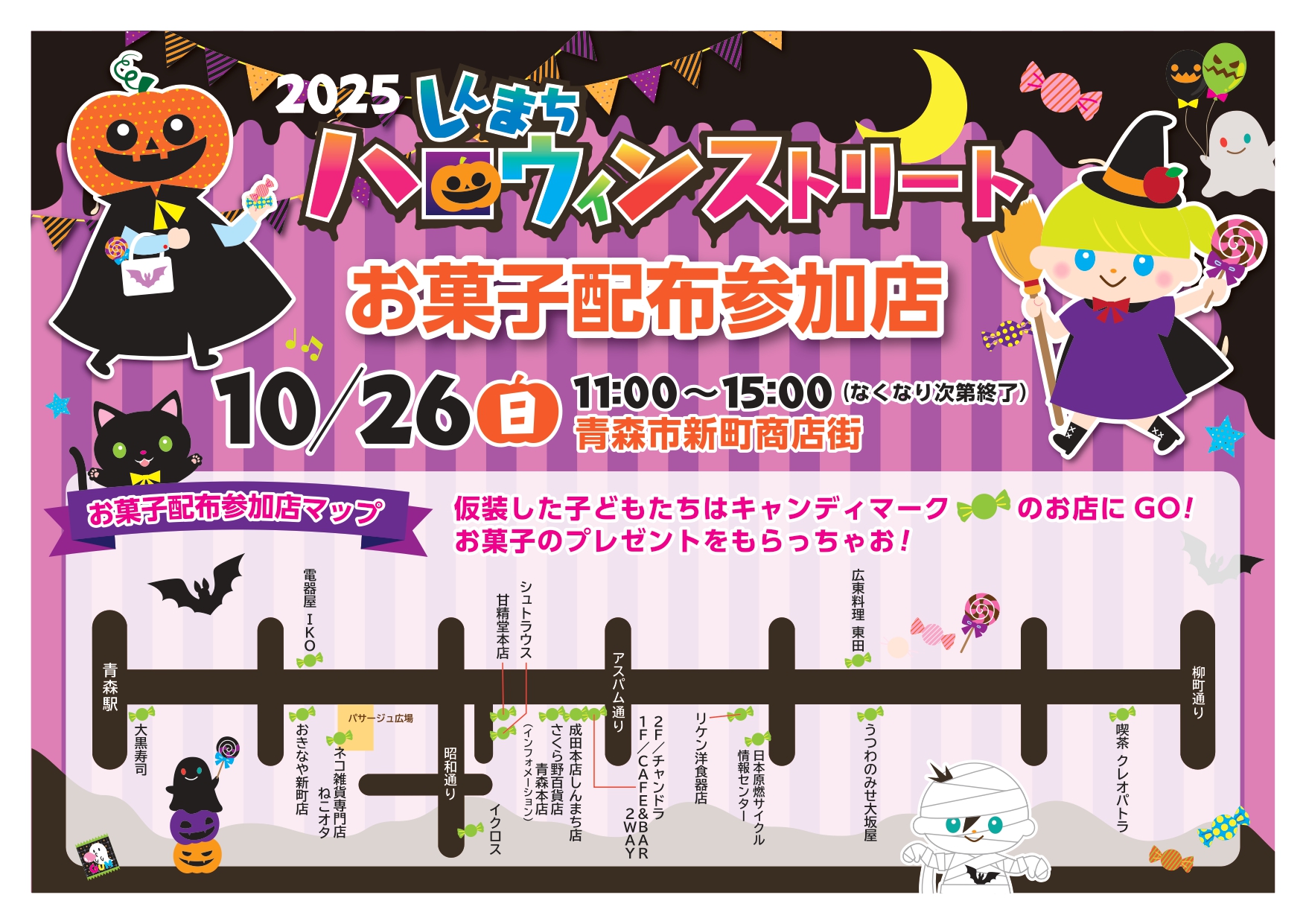 仮装した子どもたちには商店街のお店からお菓子のプレゼントがもらえちゃうぞ(地図のキャンディが目印)!スタートは11:00~。